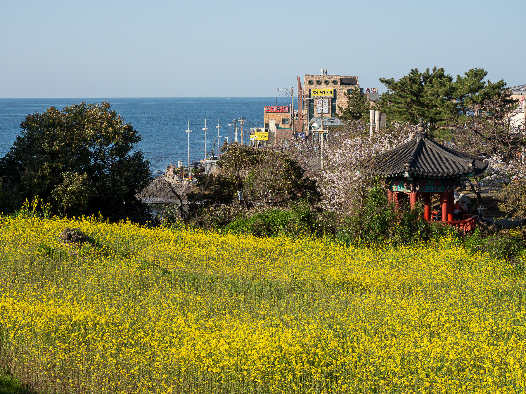Instead, we went to other famous rapeseed fields in Seogwipo that could be reached by public transport. On the way, we noticed that in Pyoseon town all those leafless and lifeless trees that we had been seeing the past 2 days had many pastel pink flowers all of a sudden. Wow, those were actually cherry blossoms and they were literally everywhere!